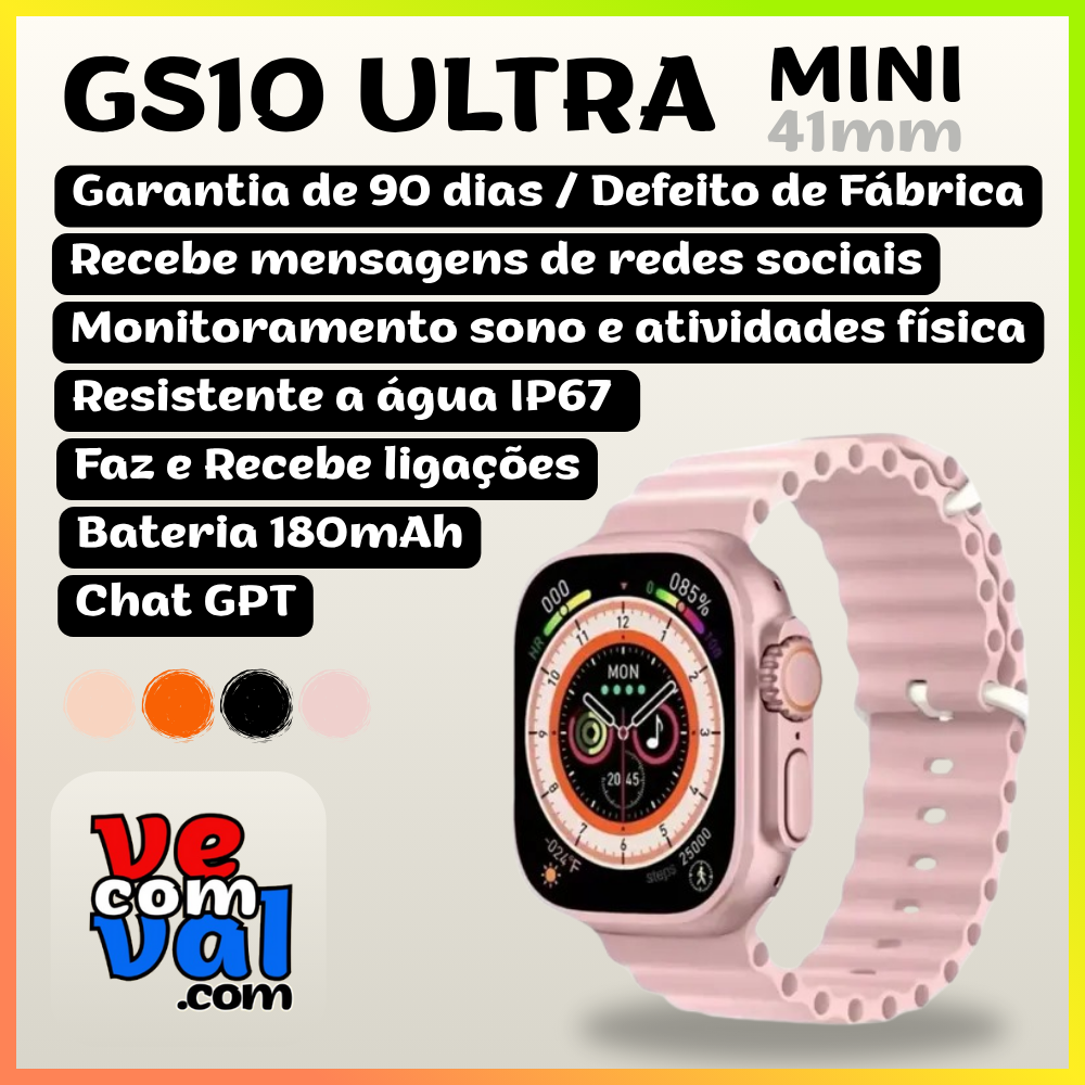 O novo modelo GS10 Ultra Mini traz o designer ultra com a delicadeza do minimalismo com seu tamanho de 41mm, com alto falantes pontilhados e watch faces dinâmicas atualizadas series 10.